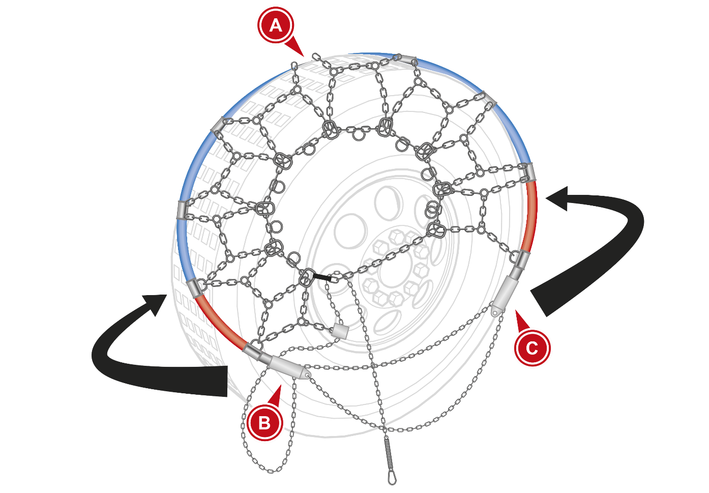 Now pull the tensioning chain towards the outside of the wheel, ensuring that it slides freely into the forged deflection hook on the tread end portion of the chain. This will bring the two ends of the rigid arc inside the wheel closer together.