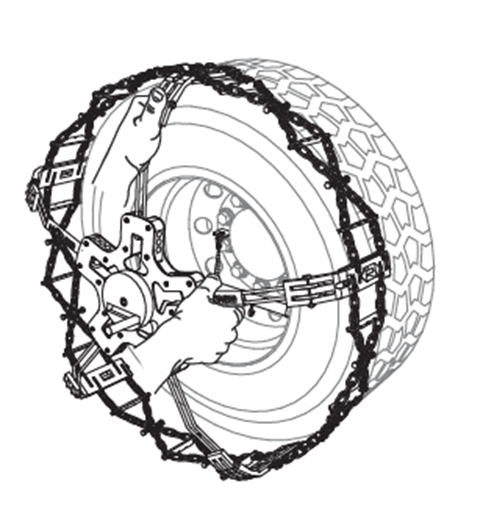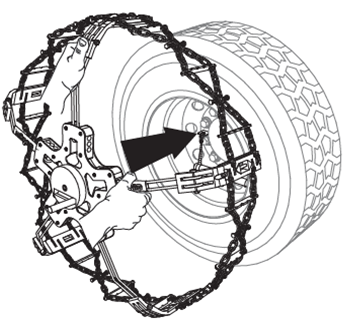 Once the chain is positioned on the wheel, push lightly on the ends of the arms to aid fitting. The tread of the K-Summit chains has elastic elements, which allow the chain to stretch elastically.