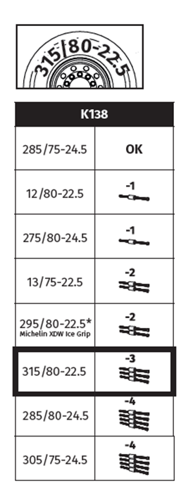 Let's take the example of tyre size 315/80R22.5 and the K-Summit Pro K138 chain: this size is indicated in the instructions as being compatible in the -3 configuration. This means that to fit this size you have to remove 3 adjusting elements from each chain from the standard configuration.