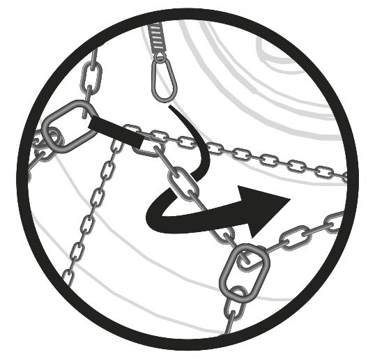 After completing the turn inside the tensioning rings, pass the spring-loaded end of the chain under the side chain (A) and secure it with the end snap hook to one of the side chain links (B).
