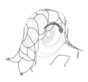 Posiziona la catena in modo tale che la catena laterale interna sia in direzione dell’interno della ruota e che la leva di tensione, il terminale a molla e la catena tirasponde siano posizionate verso il lato esterno della ruota. Agganciala ai ganci della fune di montaggio che trovi all’interno del KIT. Presenta la fune di montaggio sullo pneumatico sfruttando i tasselli del battistrada dello pneumatico per bloccarla. |