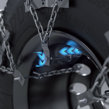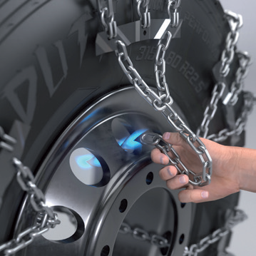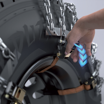 | König Tracks są połączone z bieżnikiem opony za pomocą łańcucha, z klasycznym gwintowanym systemem mocowania haka i śruby |