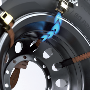 Teraz proszę poluzować i odczepić łańcuch/pasek napinający od końca gąsienicy do zewnętrznej strony koła i przełożyć go przez otwór w obręczy, wprowadzając go za koło.